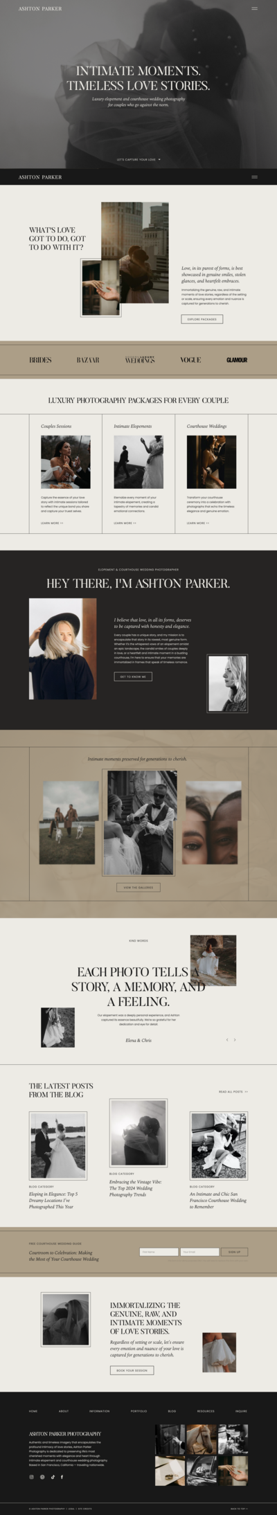 Ashton Parker is an elevated and bold Showit wedding photographer website template with a blog and gallery/portfolio to showcase your stunning work. Though the Showit template is designed for wedding photographers, it's still versatile enough to fit the needs of any and all creative entrepreneurs.